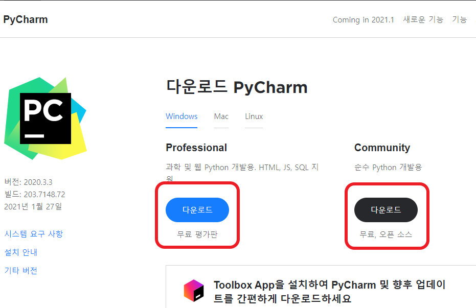 Professional은 유료버전이고 Community 버전은 무료버전인데, 단순히 파이썬의 학습을 위해서는 Community 버전을 다운로드하여 설치하면 된다.