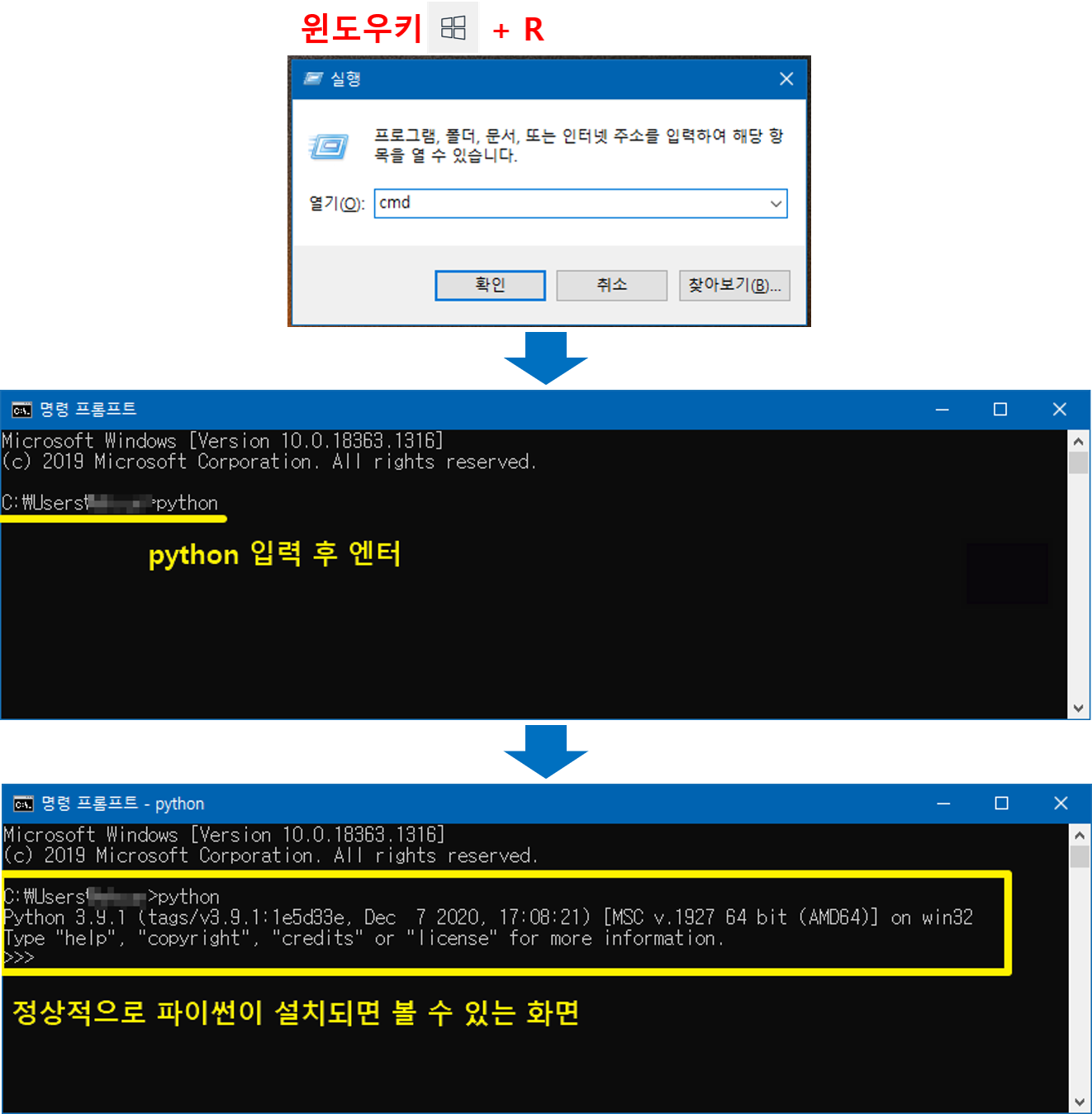 다시 한번 윈도우키+R키를 눌러 "cmd"입력 콘솔창에서 "python"을 입력하여 아래와 같은 화면이 보이는지 확인해보자.
