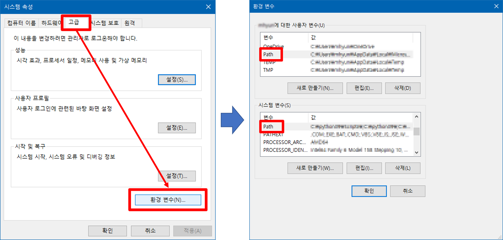 두가지 Path의 차이점은 위의 변수는 로그인된 사용자만 사용할 수 있는 환경변수이고, 아래 시스템 변수 부분은 해당 PC를 사용하는 모든 사용자가 사용할 수 있는 변수를 의미한다. 사용자 환경에 따라 분리하여 Path를 설정하는 경우도 있겠지만, 특별한 이유가 없다면 아래 "시스템 변수(S)" 부분의 Path를 수정하는 것을 권장한다.