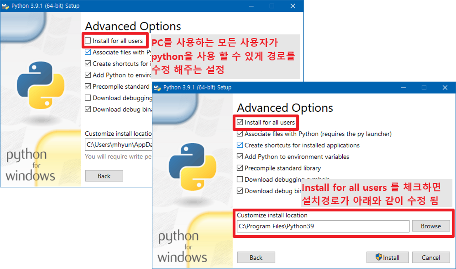 (동일한 의미로 파이썬 설치시에도 Install for all users를 선택하여 설치하였다.)