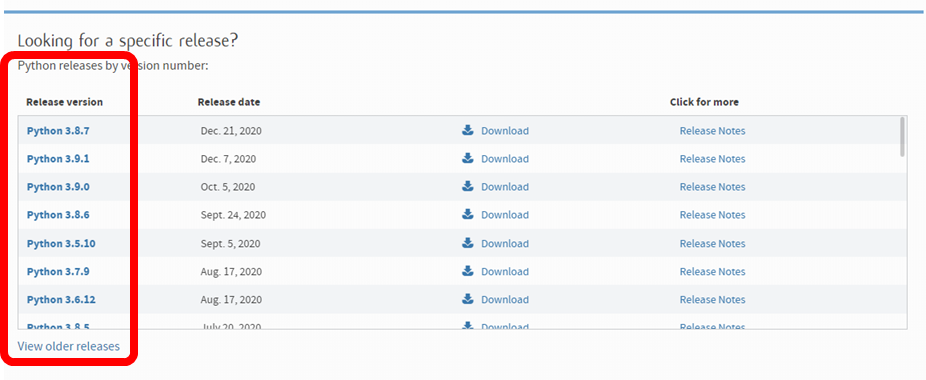 혹시 설치되어 있는 OS가 아닌 다른 OS의 파이썬이나, 특정 버전의 파이썬을 다운로드 하고자한다면, Downloads 버튼에 마우스를 올렸을때 보여지는 메뉴 중 All releases 메뉴를 클릭하여 원하는 버전의 파이썬을 다운로드 하면 된다.