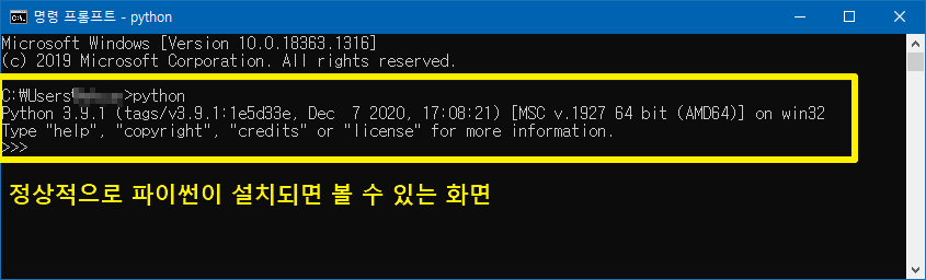 설치가 완료되면 파이썬이 잘 설치되었는지 확인해보자.