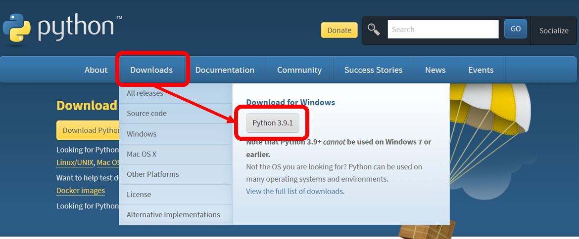 먼저 파이썬을 설치하기 위해서는 공식홈페이지 (https://www.python.org)에서 설치파일을 다운로드 해야한다.